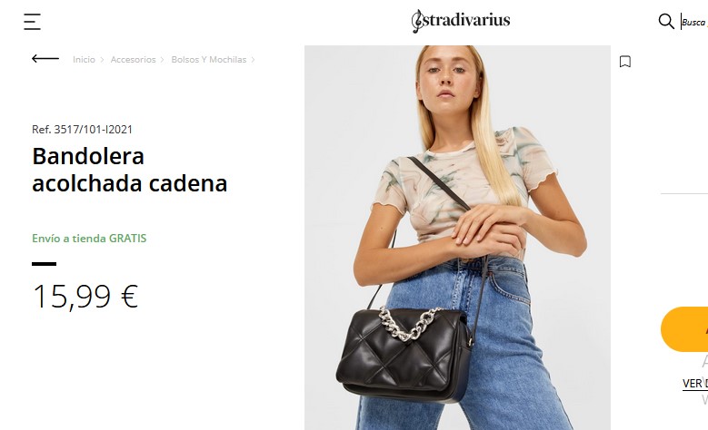 Es una hermosa bandolera completamente acolchada super elegante y cómoda de llevar a cualquier lugar. Por lo que, es otro de los productos más solicitados cuando entran a esta tienda, dado que en esta se puede conseguir gran variedad de productos. Esta bandolera está fabricada en la parte exterior 100% de poliuretano, y cuenta con un forro de 100% poliéster. Entonces, si eres de las amantes de las bandoleras, si deseas comprar estas, solo debes entrar a Stradivarius por un precio de 15,99 €.