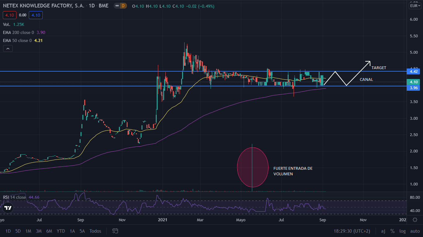 A nivel técnico, durante el año 2020, su precio ha sido alcista, hasta que, al inicio del año 2021, la cotización de Netex ha crecido en número de contratos diarios, llevándolo a su máximo histórico en los 5,30 euros por acción. Tras dicho máximo su precio cayo hasta el soporte de los 4 euros, donde se ha establecido lateral. El pasado mes de mayo se muestra una entrada fuerte de volumen, de más de 2 millones de contratos. Tomando su precio lateral como una fase de acumulación, viendo sus resultados fundamentales, y su tendencia general es alcista, podríamos esperar una ruptura del canal de forma alcista, llevando el precio en el corto-medio plazo a situarse por encima de los 4,20 euros por acción.