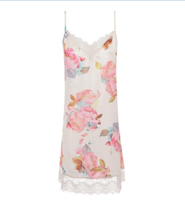 Especial para lucir el bronceado que aún te queda de tus vacaciones de verano, es este camisón de satén con estampado floral. Con finos tiros, en talle recto bordados en bajo. Perfecto para lucir toda tu silueta.