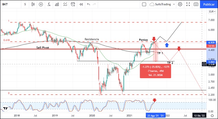 Puede ser una operación de venta la cual irá a buscar inicialmente niveles en 4,2 euros por acción donde posteriormente visitaría los 3,68 euros. Si el precio visita el anterior nivel y realiza un retroceso a modo de pullback respetando los 4,5 euros, será el trigger suficiente para adherir en posición de venta en busca de niveles alrededor de 2,5 euros. Este tipo de operaciones suelen ser intradía generando una rentabilidad inicial promedio del 10% y al segundo objetivo del 25% con un ratio de riesgo sobre beneficio 1@4 veces.