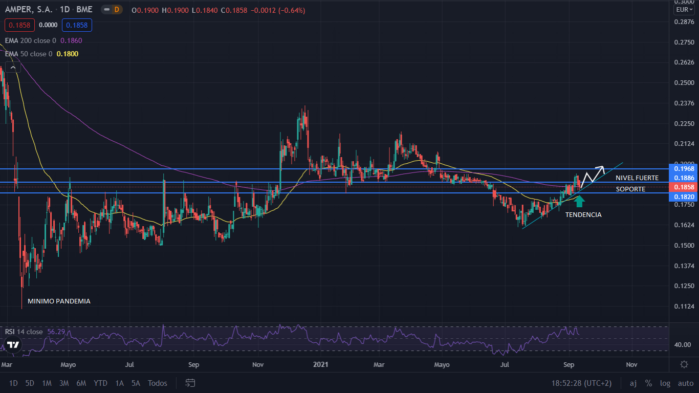 A nivel técnico, desde el mínimo marcado por la pandemia en los 0,11 euros por acción, Amper creció lentamente en tendencia alcista, hasta alcanzar los 0,23 euros por acción en diciembre de 2020, lo que supone un crecimiento del 113%. Tras dicho máximo, su precio paso a una tendencia bajista que en julio de este año tocaba su mínimo en los 0,16 euros por acción, perdiendo así un 31%. Actualmente el precio se encuentra en tendencia alcista, intentando superar el nivel fuerte de los 0,1886 euros por acción. Para el corto plazo, en un macro alcista, Amper continuaría la tendencia y superaría dicho nivel, para ir a tocar la siguiente resistencia de los 0.19 euros por acción. En un marco bajista, de tener en cuenta que es un nivel fuerte, y el indicador RSI se encuentra en sobrecompra, podríamos perder la tendencia alcista y ver realizar un retroceso a los 0,1820 euros por acción.