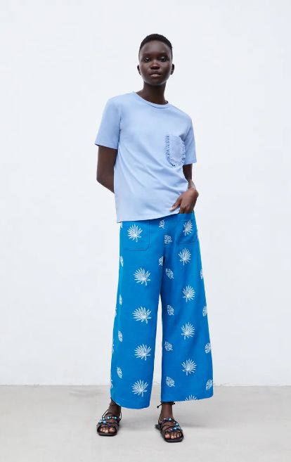 Una de las camisetas que se pueden encontrar en Zara para usar a diario que mejor está funcionando en cuanto a número de unidades vendidas es esta camiseta con bolsillo y volantes. Se trata de una prenda que destaca por tener un bolsillo bordado en su parte delantera que le da al diseño mucha personalidad. Está disponible en cuatro colores y su precio es de 5’95 euros.