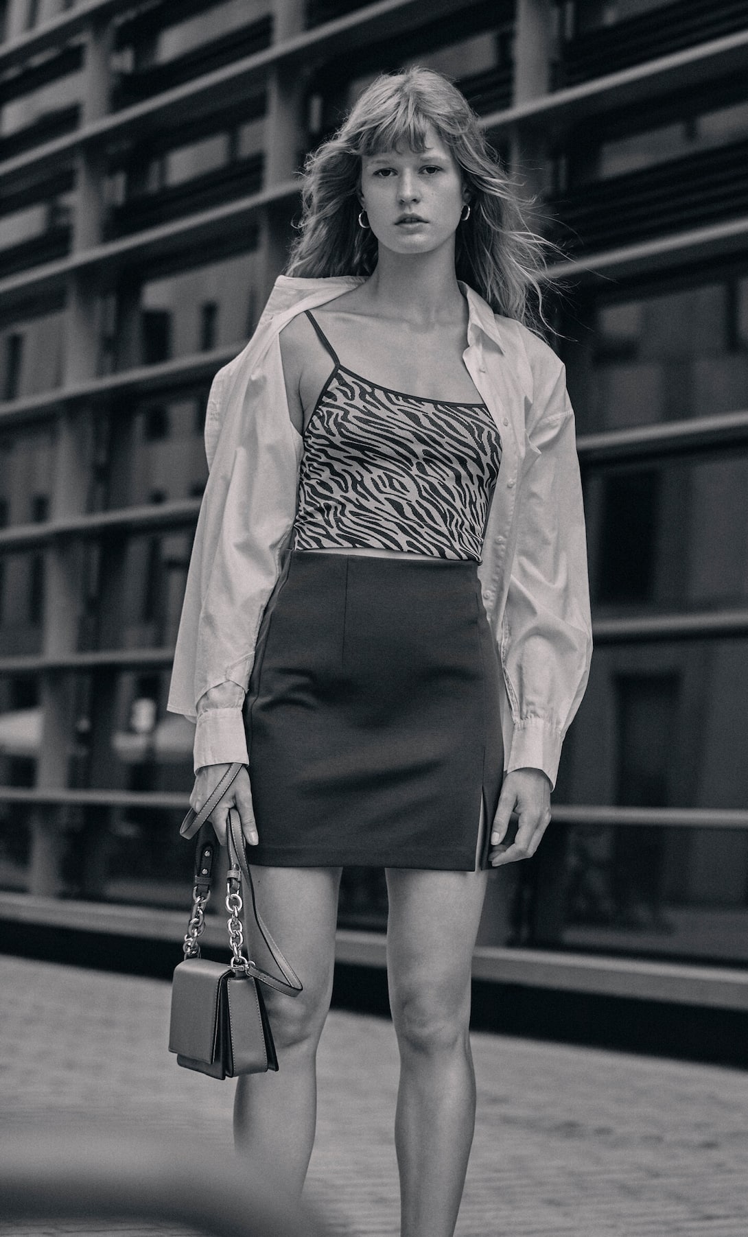 Quieres lucir el esplendor de tu silueta, que tu cuerpo destaque tu glamour y tu elegancia. Busca en las tiendas Stradivarius esta delicada falda mini punto, de tiro alto, entallada a tu cintura y una destacada abertura en su parte lateral.