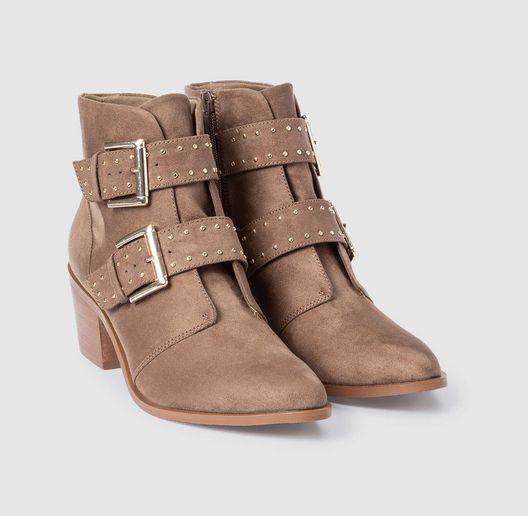 La marca Green Coast de El Corte Inglés nos trae este diseño de botines verdaderamente especiales. Son de un bonito y delicado color topo que contrasta con los metalizados de las tachas decorativas y el cierre con hebilla cuadrada. Tiene un tacón de 6 cm de altura tipo bloque y puntera fina. La caña es de 11 cm de altura, y el contorno de 23 cm. Versátiles y fáciles de combinar, aportan un toque de estilo a cualquier look. Son 100% PU y con el descuento del 50% ahora te las puedes llevar por 24,95€. Este es el enlace.