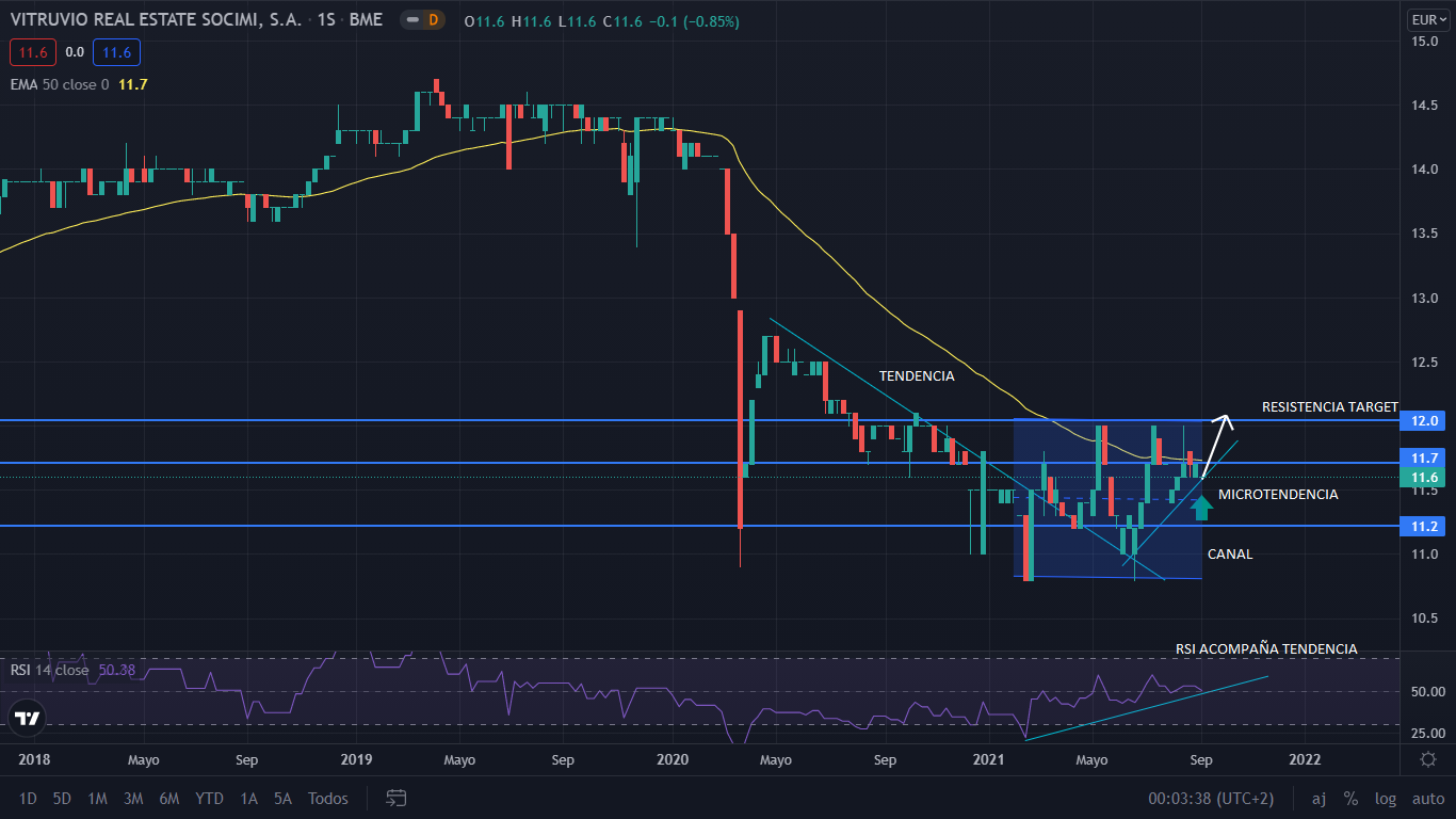 A nivel técnico, desde el mínimo marcado por la pandemia en los 11 euros por acción, siendo esta caída del 21%. Su precio creció un 17% en el mes siguiente, donde inició una tendencia bajista que duro los 9 meses siguientes, alcanzando un nivel inferior a la caída por la pandemia, situado en los 10,8 euros. Tras dicho mínimo, su precio se ha establecido lateral entre los 12 y los 10 euros por acción. Actualmente, Vitruvio se encuentra formando una microtendencia alcista, que, para el corto plazo, de seguir la tendencia, el precio velería a tocar los 12 euros por acción. Si para los próximos meses mejoran su fundamentales, y su precio sale de la formación lateral y se establece en tendencia, será alcista, con los 12,50 euros como siguiente objetivo.