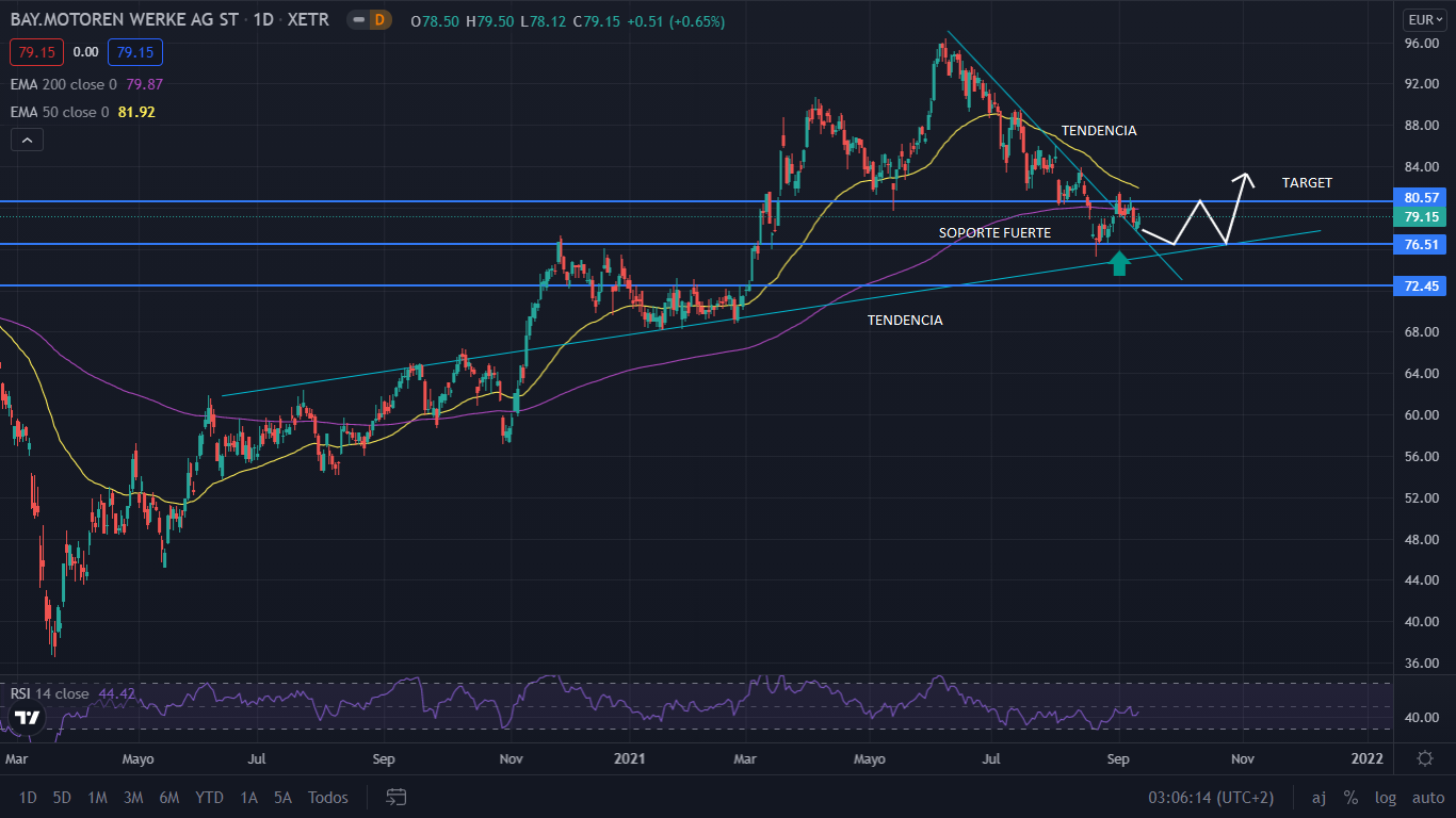 A nivel técnico, desde el mínimo marcado por la pandemia en los 36 euros por acción, BMW inició una tendencia alcista, y que a partir de noviembre el precio subió más fuerte, alcanzado los 96 euros por acción, un crecimiento total del 165%. Tras dicho máximo, alcanzado en el mes de junio de este año, su precio paso a una tendencia bajista. Actualmente el precio se ha soportado en el nivel fuerte de los 76 euros por acción, llevando al precio a salir de la formación bajitas. Para el corto plazo, BMW apunta a volver a alcista, eso lo llevaría a superar su siguiente resistencia, colocando el precio por encima de los 80 euros por acción.