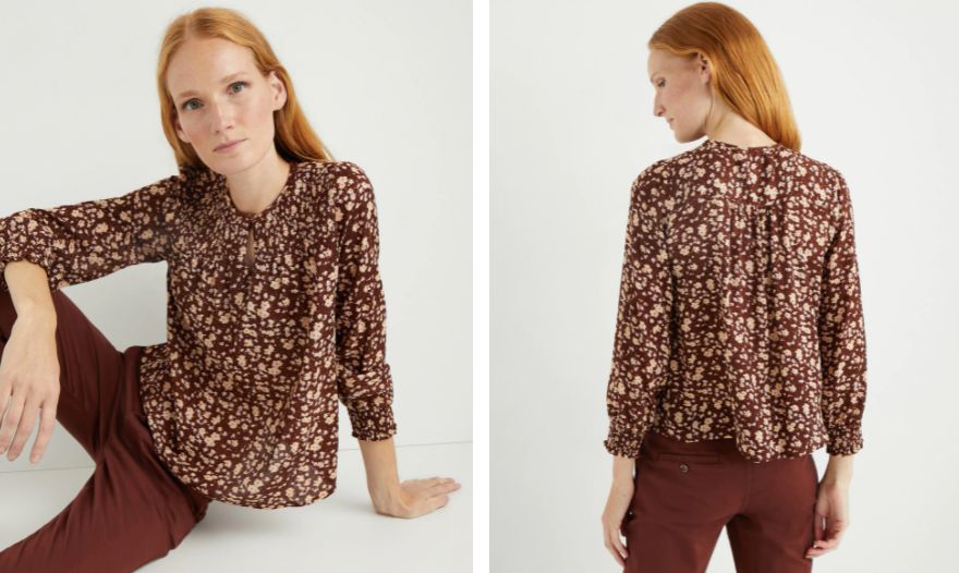 Te presentamos ahora otra gran opción para renovar tu armario para la nueva temporada e ir a la última. Por ejemplo con este blusa Indi & Cold de manga larga. Como ves la tendencia es clara en casi todos los modelos. En este caso es de color granate, tipo Julia en bámbula, con otro estampado floral con canesú, nido de abeja y cuello caja. Una prenda 100% en viscosa que será sin duda un referente en tu vestir otoñal y que puedes comprar en El Corte Inglés aquí. Su precio es de 59,90 euros.
