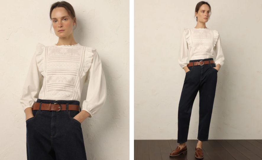Es una prenda de manga larga abullonada con cuello redondo bordado, detalles de bordados en el cuerpo y volantes en los hombros. Es una blusa versátil y femenina confeccionada en un tejido texturizado de 100% algodón y que El Corte Inglés vende por 49,99 euros.