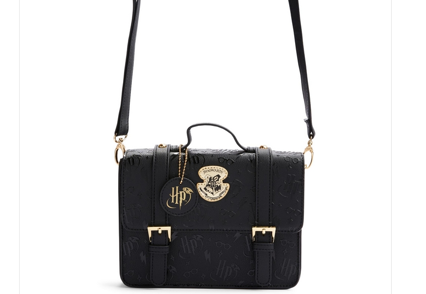Un diseño compacto, en color negro, con detalles de correas con hebilla metálica en dorado, asa para llevar en la mano, o correa para colgar en el hombro. Además, tiene aspecto piel, con grabados en relieve que te recordarán al mítico protagonista, así como adornos de la saca de libros y películas Harry Potter.
