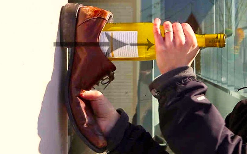 Coloquemos la botella dentro del zapato, sostén bien la botella en su parte superior con una de tus manos, procede a golpear con algo de fuerza la botella dentro de tu zapato contra la pared, repite la operación hasta que el corcho empiece a salir. Cuando este la mitad del corcho fuera intenta retirarlo directo con tus manos. Para mayor seguridad envuelve con tu pañuelo la parte inferior de la botella.