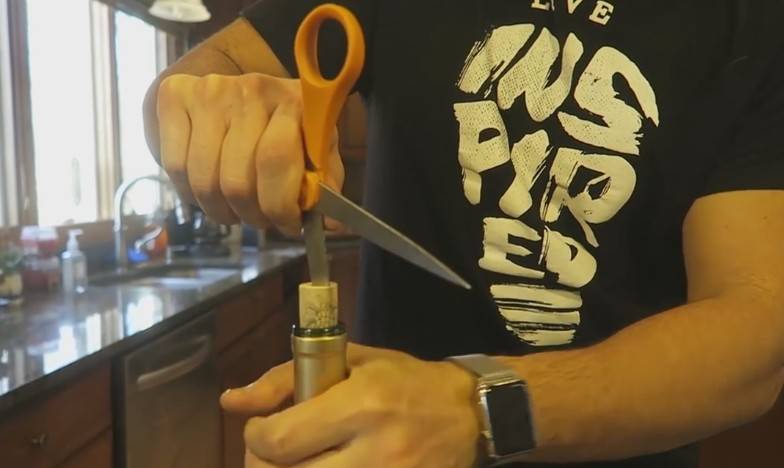 La parte más delgada de las tijeras la insertamos en el centro del corcho, hacemos un poco de presión hasta llegar a la mitad del corcho. Gira con cuidado pero con fuerza hacia los lados. El corcho comenzará a salir dentro de la cuchilla de la tijera, al legar a la mitad, retira la tijera del corcho y termina de sacarlo con tus manos.