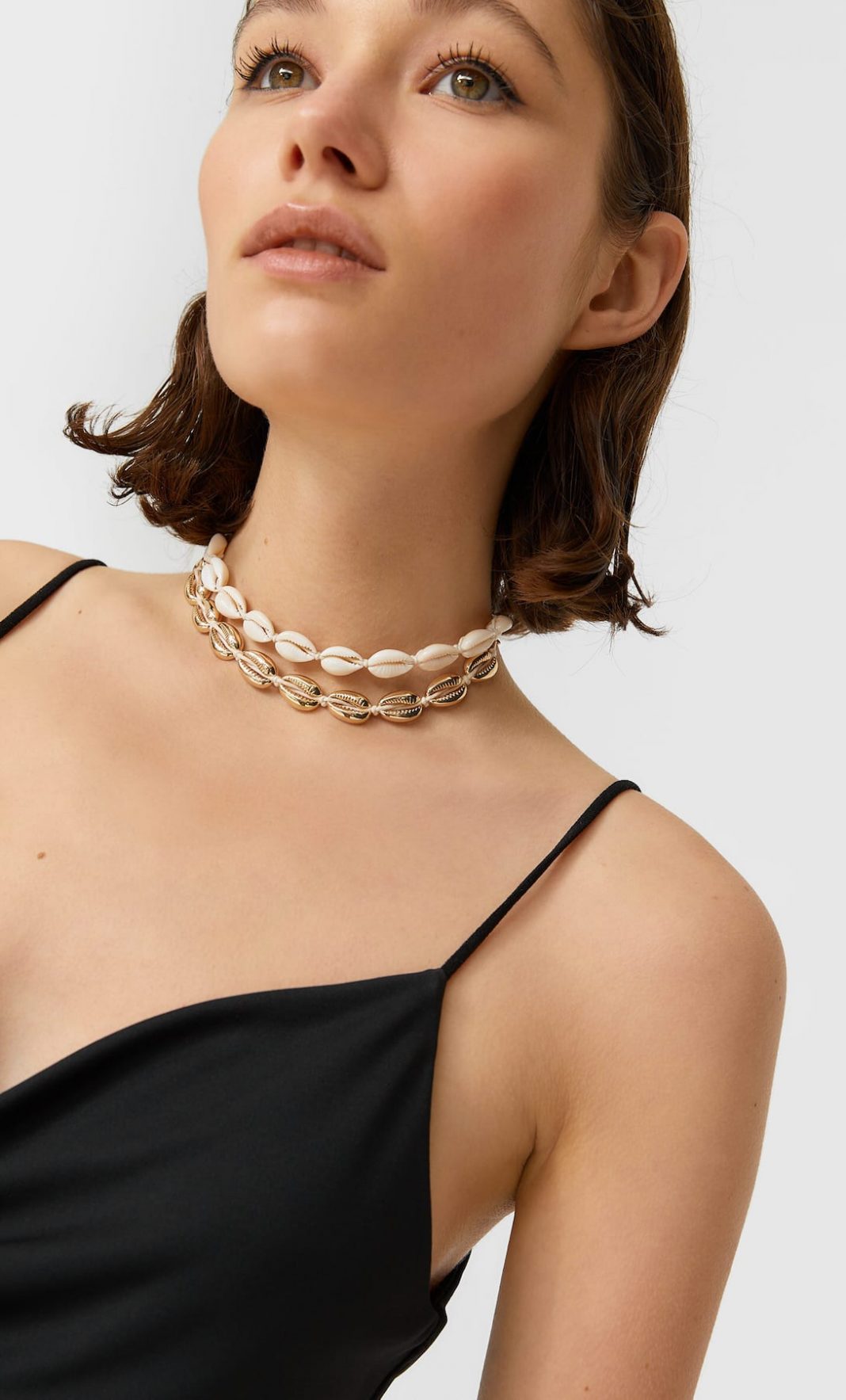 Este set 2 chokers conchas, que traen las tiendas Stradivarius, son todo un espectáculo para lucirlo en tu cuello. Ajustado cual gargantilla hará que deslumbres con el brillo de tu cara.