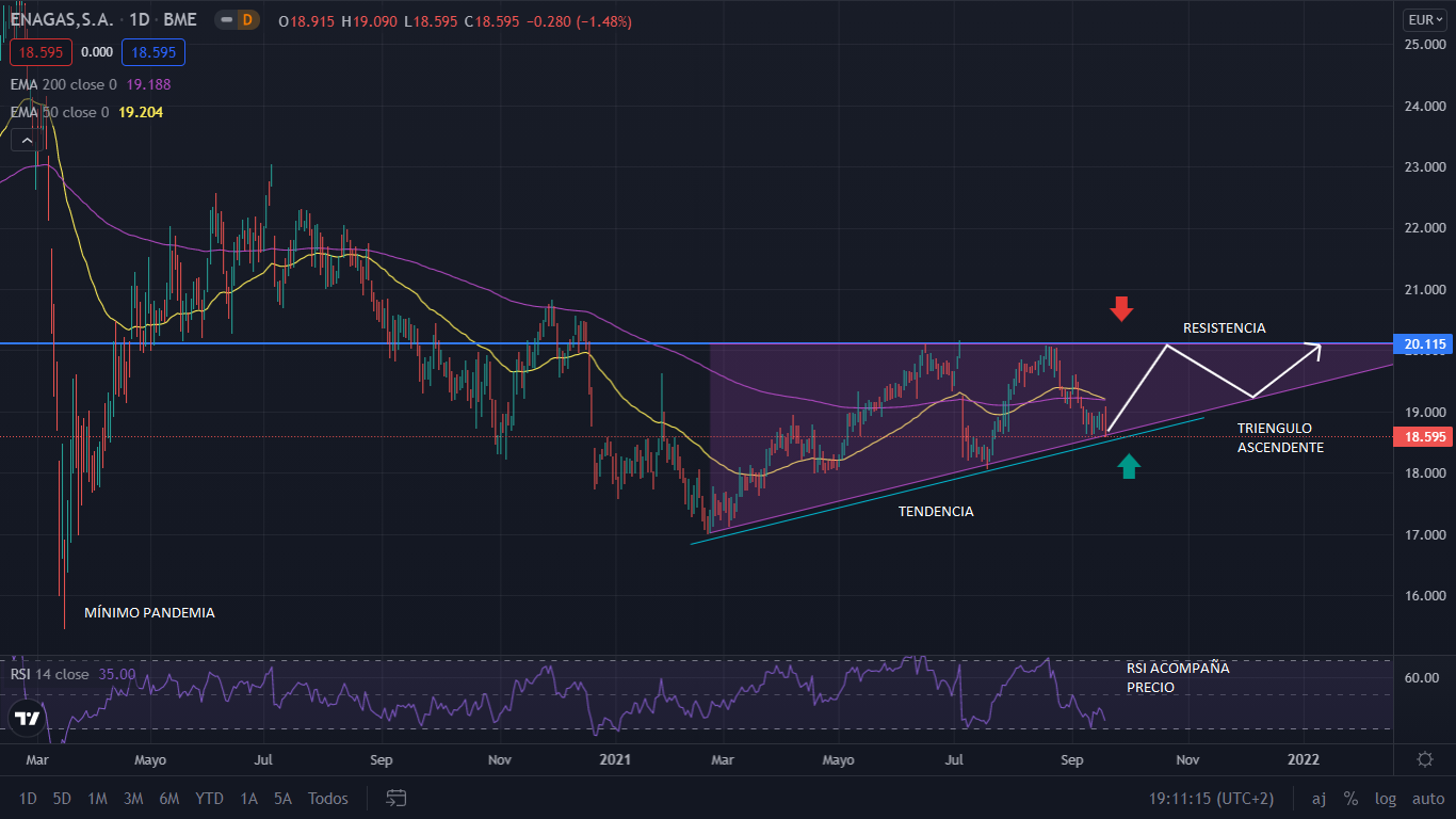 A nivel técnico, desde le mínimo marcado por la pandemia en los 15,45 euros por acción, Enagás creció rápidamente un 50% hasta los 23 euros por acción. Tras dicho máximo, el precio paso a una formación bajista de 7 meses perdiendo un 23%. Desde febrero de este año Enagás pasaba a alcista, tras dos intentos de superar los 20 euros, su formación actual es de triángulo ascendente. Para el corto plazo, de continuar con la formación de triángulo, el precio volverá a buscar los 20 euros, de aprovechar dicho movimiento, obtendríamos un +8%. Para el medio plazo, de no tener ninguno fundamental que altere el precio de Enagás, saldría de la formación superando los 20 euros para finales de 2021.
