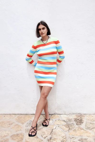 Con seguridad esta es la prenda que te sacará de muchos apuros. El vestido puntos raya canalé de Zara, viene en tamaño mini, con mangas largas y cuello redondo, confeccionado en 100% algodón reciclado.