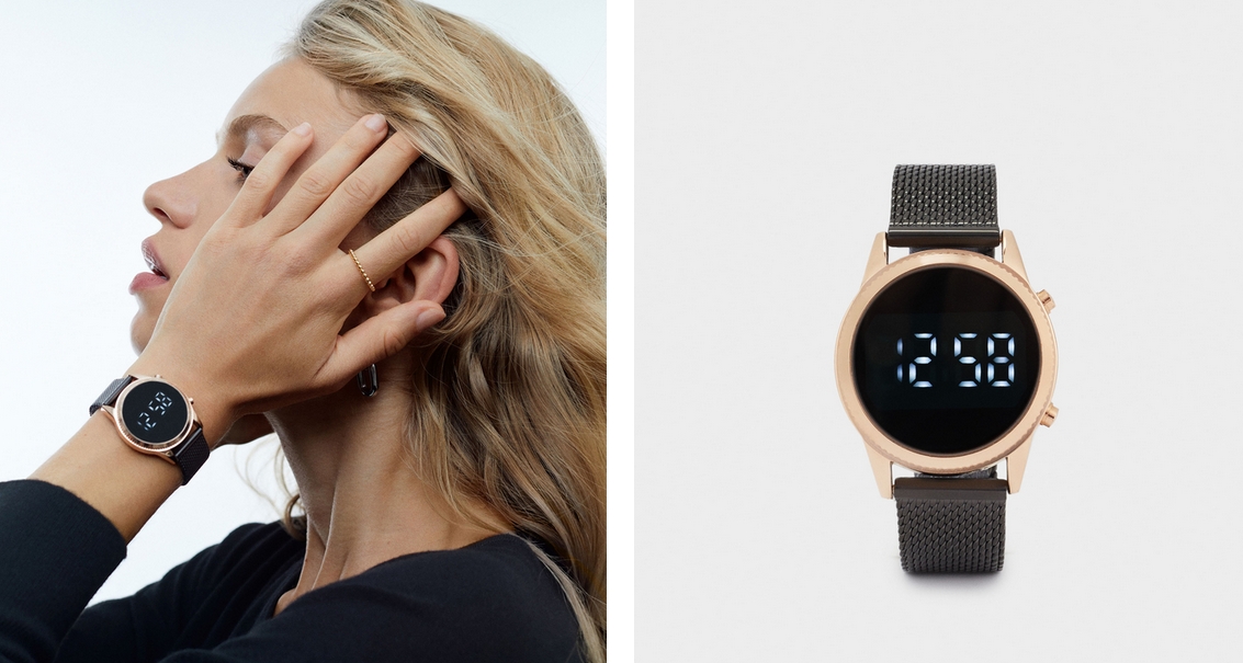 Si te gustan los relojes, Parfois también tiene una buena colección de ellos, como este digital con esfera redonda y correa de acero. La correa está disponible en color negro o dorado, para que elijas la que prefieres. Su precio es de 32,99€.