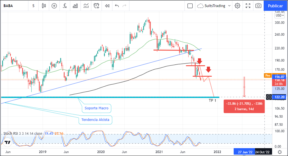 En concordancia al mismo análisis, mantenemos la posición bajista en el corto y mediano plazo la cual ha venido desarrollando más del 13% desde nuestro primer punto de entrada. Sin embargo, el precio está realizando un triple breakdown el cual, ante un retroceso a modo de pullback en niveles de 156 dólares, podría generar un impacto bajista mayor para buscar como objetivo el soporte macro de noviembre de 2014 en niveles de 120 dólares por acción. Esta adhesión en ventas para la acción de Alibaba estima un 20% de rentabilidad la cual y de acuerdo con la situación actual de China y sus empresas insignia, puede llevar el precio al cumplimiento del objetivo.
