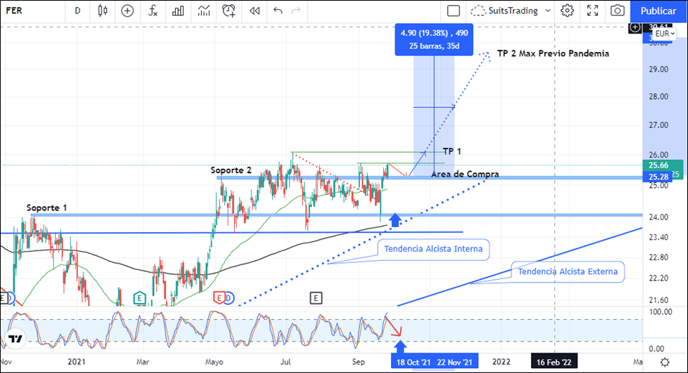 La acción de Ferrovial a respetado el soporte más importante de gráfico diario del 24 de noviembre de 2020 ubicado en 24,03 euros (Soporte 1), desde donde a inicios de esta semana se apoya tomando impulso en busca de su máximo anterior ubicado en niveles de 26 euros.