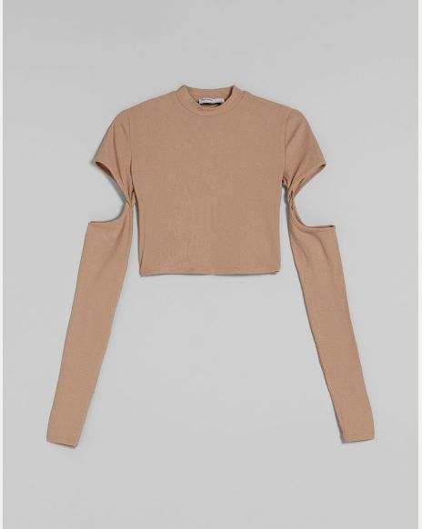 Otra de las prendas que más nos ha llamado la atención del catálogo de novedades de Bershka es esta de la que te hablamos a continuación. Se trata de una camiseta de manga larga que tiene una singularidad que hace de ella una prenda muy original. Nos referimos a las aberturas que tiene en medio de cada una de las dos mangas. Está disponible en tres colores distintos y su precio es de tan solo 12’99 euros.