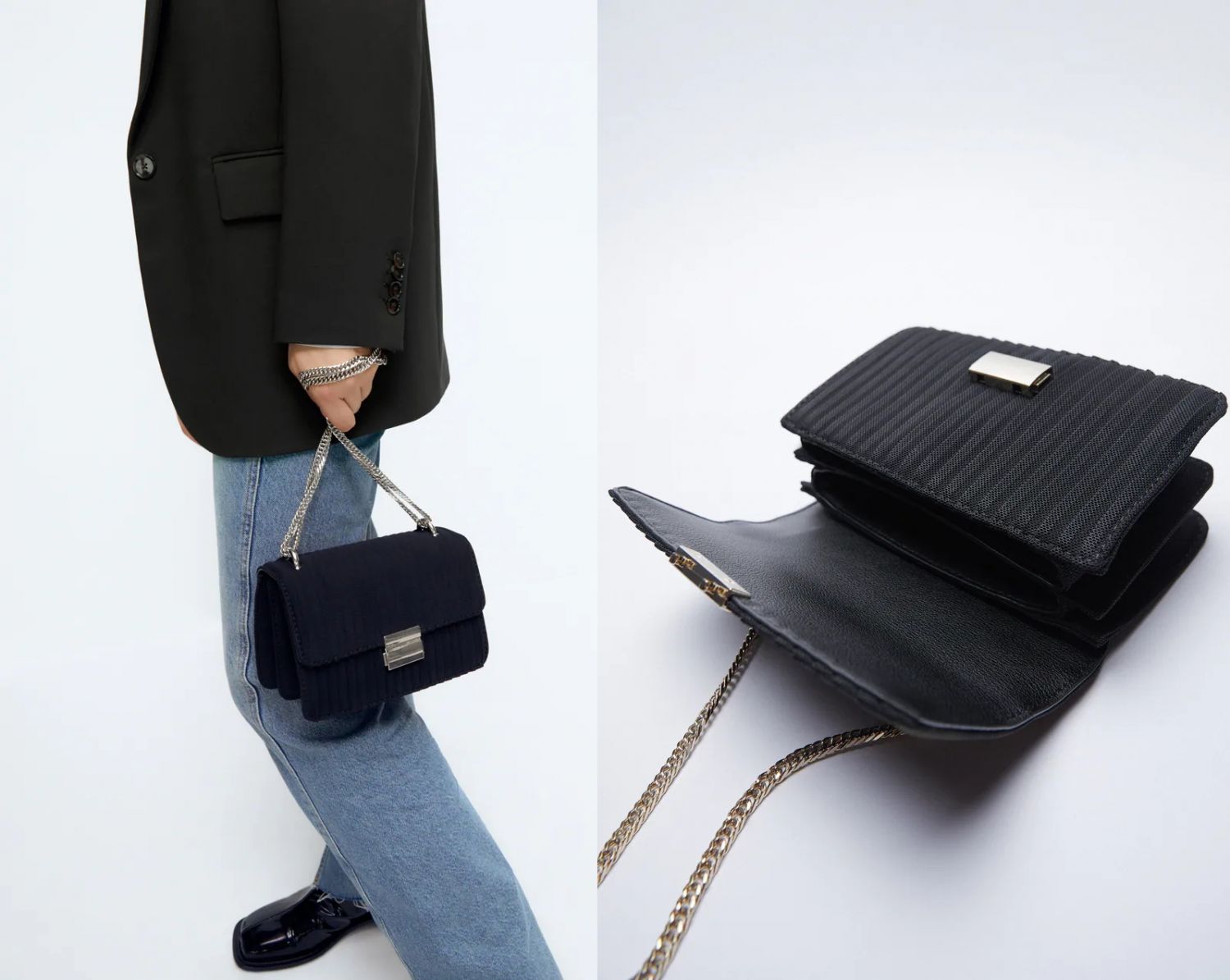 Uno de los mejores bolsos para lucir este otoño es esta bandolera con cadena de Zara. Su precio es de tan solo 25,99€ y la encontrarás en color negro.