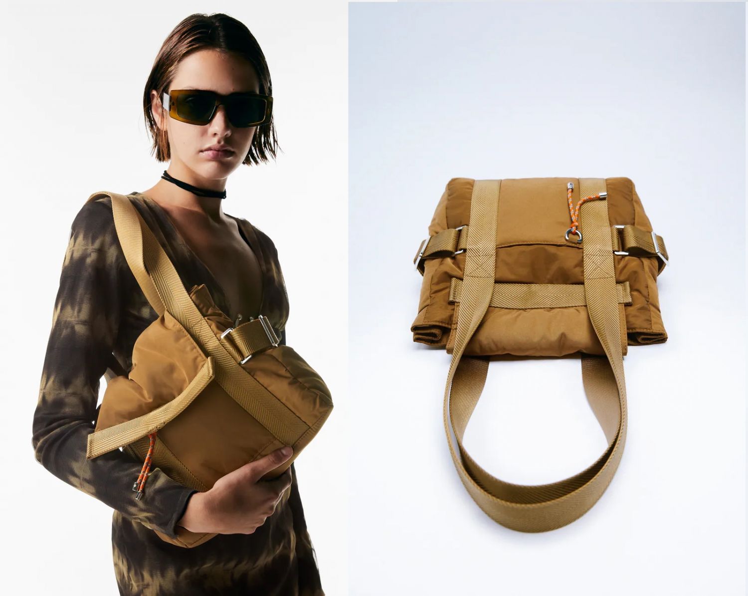 Esta shopper nylon con asas en el frontal de Zara también es otra de las piezas por solo 25,95€. Disponible en color marrón y en formato shopper para tener un amplio espacio para guardar todo lo necesario durante las sesiones de compras.