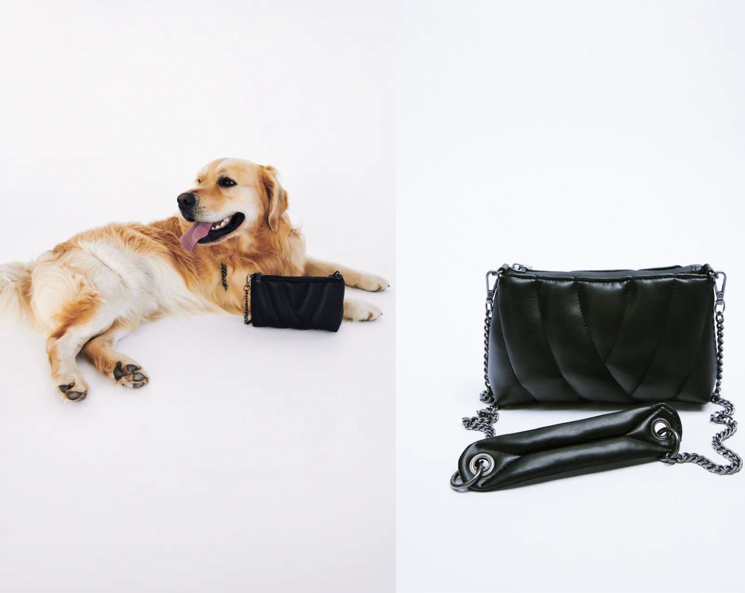 Este bolso en formato bandolera tiene un cuerpo acolchado, con detalle de pespunte, interior forrado con bolsillo interno para meter bolsas para mascotas, apertura frontal redondeada en metal, asa de cadena y cierre de cremallera.