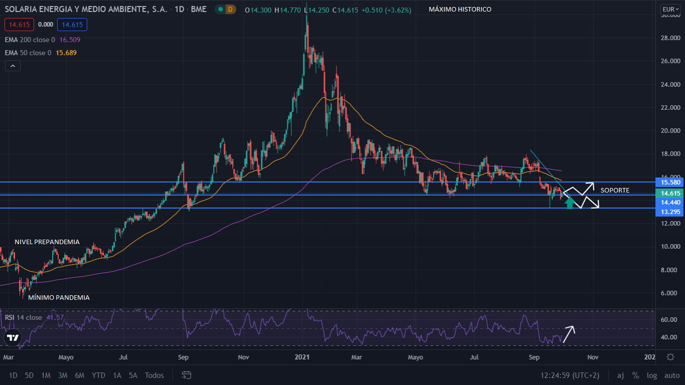 A nivel técnico, desde el mínimo marcado por la pandemia en los 5,53 euros por acción, Solaria inició una tendencia alcista en la que subió un 461%, alcanzado los 30,80 euros por acción, siendo este un máximo histórico en su cotización. Tras dicho máximo su precio cayó un 53%, quedándose en los 14,39 euros por acción, en junio de este año. Tras un intento de volver a alcista Solaria se encuentra nuevamente bajista y se aproxima a perder los 14 euros. Actualmente el precio está en el soporte 14,44, y si la presión bajista continua, para el corto plazo, lo llevaría a perder dicho soporte, los 14 euros, e ir al siguiente soporte en los 13,29 euros. Si los buenos resultados de este semestre tienen un impacto positivo para Solaria, lo llevaría a salir de la estructura bajista, y recuperar los 15 euros.