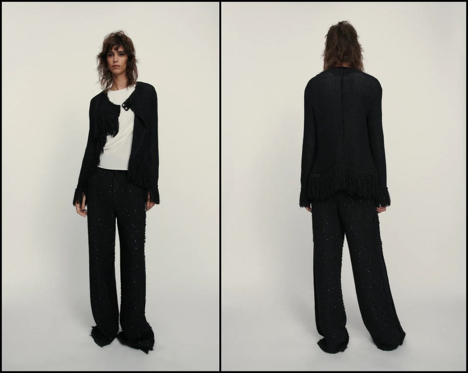 Otra de las prendas especiales de Zara es este pantalón con estructura Limited Edition. Disponible en negro y en varias tallas por 59,95€. Para él se han empleado mezclas de tejidos como la lana, el acrílico, algodón, poliéster, viscosa y otras fibras. Con un forro interior 100% poliéster.