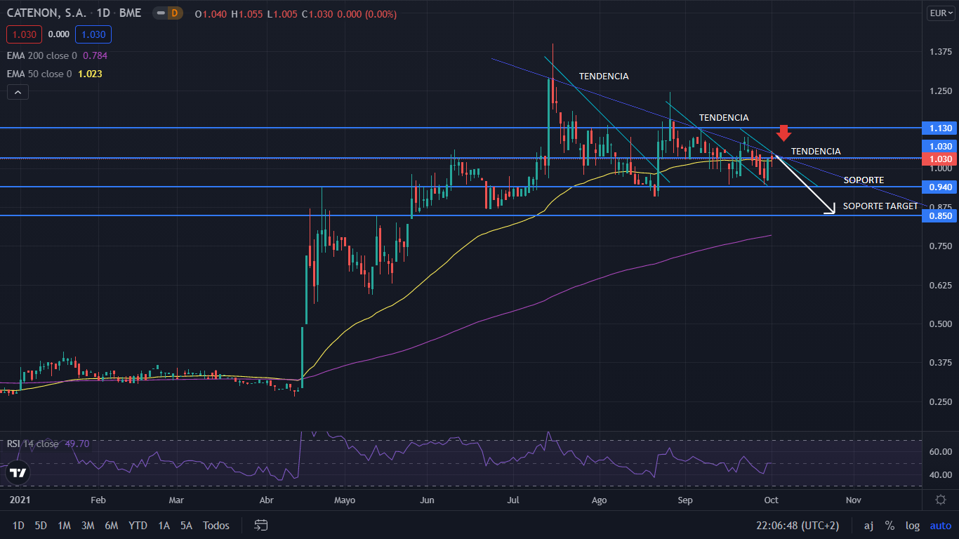 A nivel técnico, la cotización durante el año 2020 para Catenon, se mantuvo lateral por debajo d los 0.40 euros por acción. En abril de este año, el precio rompía alcista con un crecimiento del 240%, y que después corrigió para despees pasar a una tendencia alcista, sumando un total de un 390%, alcanzado los 1,40 euros por acción, siendo este su máximo histórico. Tras marcar dicho máximo, el precio paso a bajista. Actualmente se encuentra en dos posibles estructuras; de ser una formación de tendencia bajista, su precio perderá el soporte actual de los 0,94 euros, perdiendo el 1 euro por acción. De lo contrario si se encuentra en una formación de triangulo, el precio ropería la tendencia bajista y se dirigiría a la resistencia de los 1,13 euros. En ambas situaciones se vería una confirmación, tanto si ropa el soporte o perfora la tendencia.