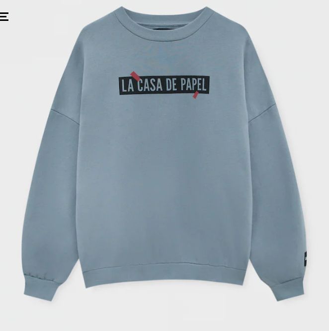 Pull&Bear no solo está diseñando camisetas de la serie La casa de papel. También está diseñando otro tipo de prendas como por ejemplo esta sudadera. Se trata de una prenda que se caracteriza por tener un corte oversize y un bonito color azul ceniza. Además tiene motivos de la serie tanto en la parte delantera como en la trasera. Su precio es de 29’99 euros.