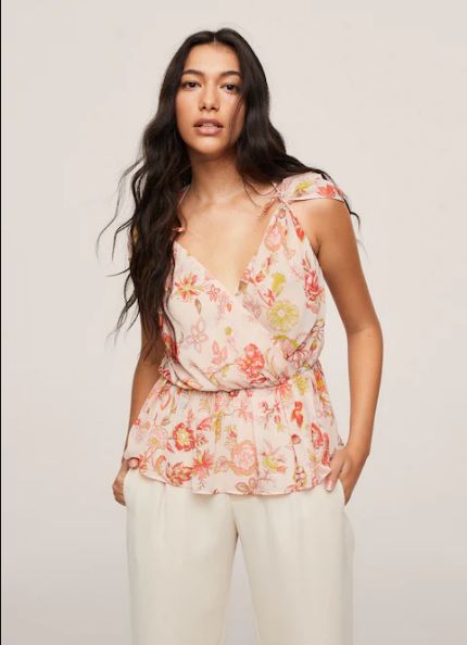 Las tiendas mango traen en su colección de blusas casuales esta blusa escote cruzado, una prenda bastante atrevida para la mujer que le gusta presumir su silueta. En diseño corto, escote cruzado, sin mangas lazos decorativos, fruncido elástico en su cintura.