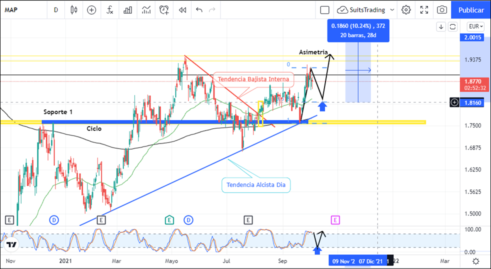 Actualmente el precio se encuentra con niveles de sobrecompra respecto al índice de fuerza relativa estocástico, lo que denota un posible retroceso al área de regularidad de mercado en gráfico de marco diario en niveles de 1,81 euros por acción. Este valor confluye con el nivel 61,8 de retroceso de Fibonacci.