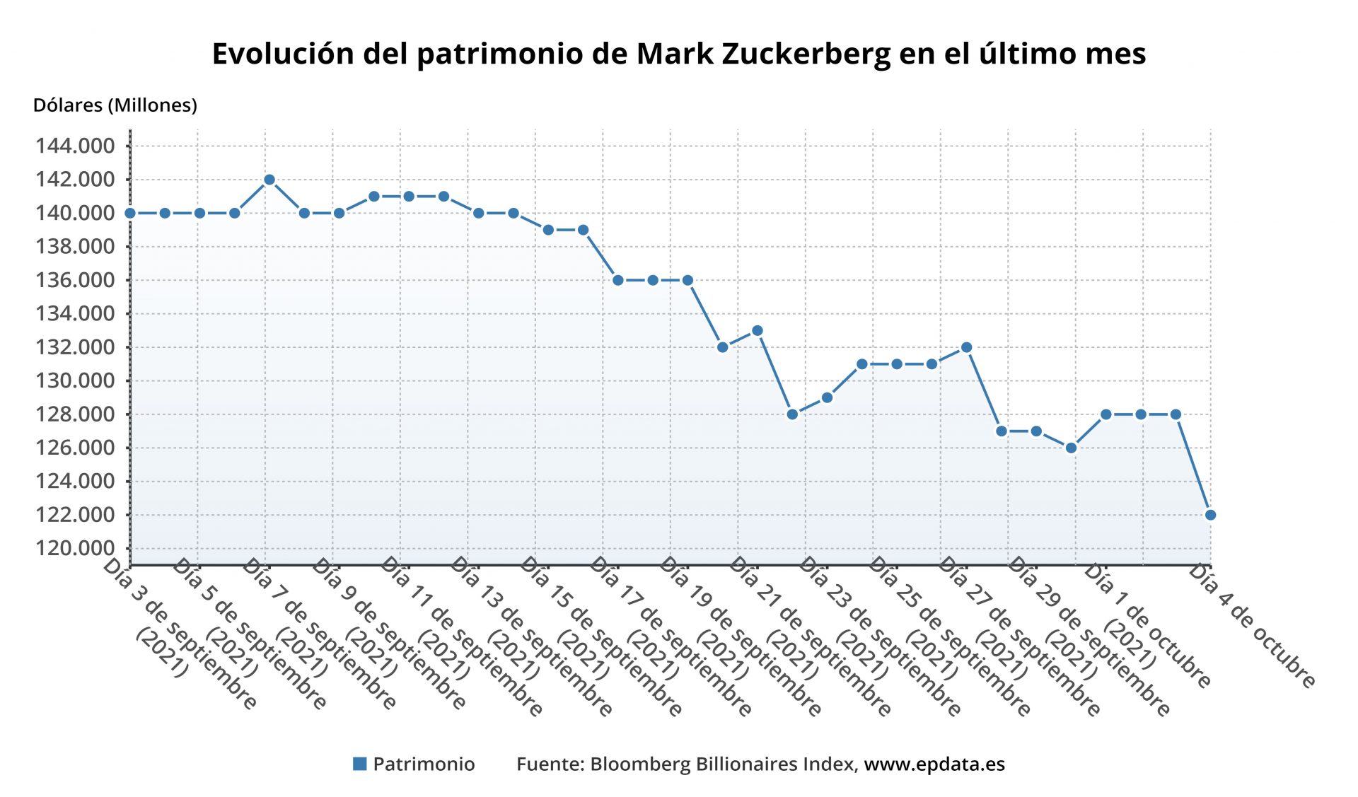 El patrimonio estimado de Mark Zuckerberg, se redujo este lunes en alrededor 6.000 millones de dólares. La consecuencia principal ha sido el desplome de las acciones de la popular red social, después de los problemas sufridos el lunes por Whatsapp, Facebook e Instagram, cuyos servicios se reanudaron después de seis horas. Según los datos de Bloomberg Billonaires Index, la fortuna personal de Zuckerberg se hundió hasta los 122.000 millones de dólares, lo que supone una caída de 6.110 millones de dólares respecto a la sesión anterior.
