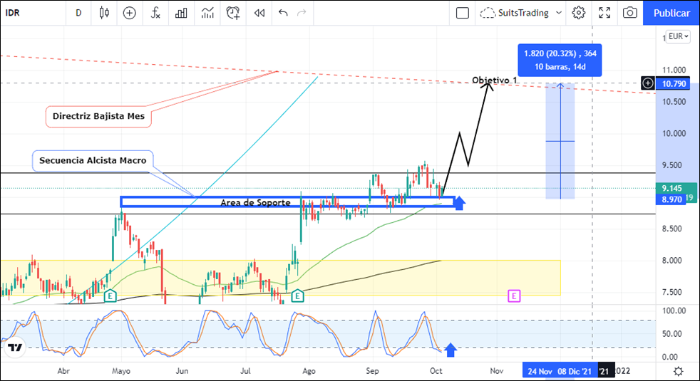 Actualmente el precio se encuentra trabajando sobre un área de soporte establecida entre el 30 de abril y el 13 de agosto en niveles entre los 8,7 euros 9,05 euros por acción. Esta área de soporte ha sido respetada e impulsada al mismo tiempo por la media móvil exponencial de 50 periodos. Adicional a esto, el índice de fuerza relativa se encuentra en niveles extremos de sobreventa apoyando la idea de la continuación alcista para ir por el objetivo trazado de acuerdo con la directriz bajista macro ubicada en proximidades de 10,7 euros por acción. Esta operación daría más de un 20% de rentabilidad para el corto y/o mediano plazo con un ratio de riesgo sobre beneficio de 1@5 veces.