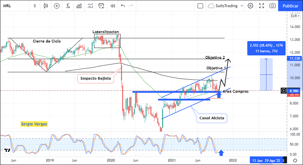 La acción de Merlin en gráfico de marco semanal presenta doble estructura alcista tanto desde el punto de vista psicológico como técnico que la sitúa como una de las acciones oportunas dentro de nuestro portafolio. Antes de la llegada del COVID 19, la acción de Merlin ya mostraba un cierre de ciclo el cual posterior a ese cierre, genera una lateralización. Esta formación hace referencia a un patrón psicológico de mercado que involucra una caída abrupta del precio de la acción la cual se confirma con la pandemia. Posterior a toda la caída, el precio irá a buscar al menos el nivel 61,8 de retroceso de Fibonacci que se traza sobre el cierre de ciclo, es decir, en niveles cercanos a los 11,5 euros por acción.