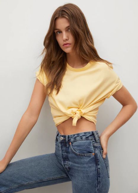 Disfruta de tu imaginación cuando desees combinarla. No tan casual que la puedes llevar a tu oficina y totalmente atrevida para llevarla con unos delicados y ajustados pantalones cortos, con un nudo en la cintura. En un delicado color amarillo y en promoción mango por 7.99 euros.