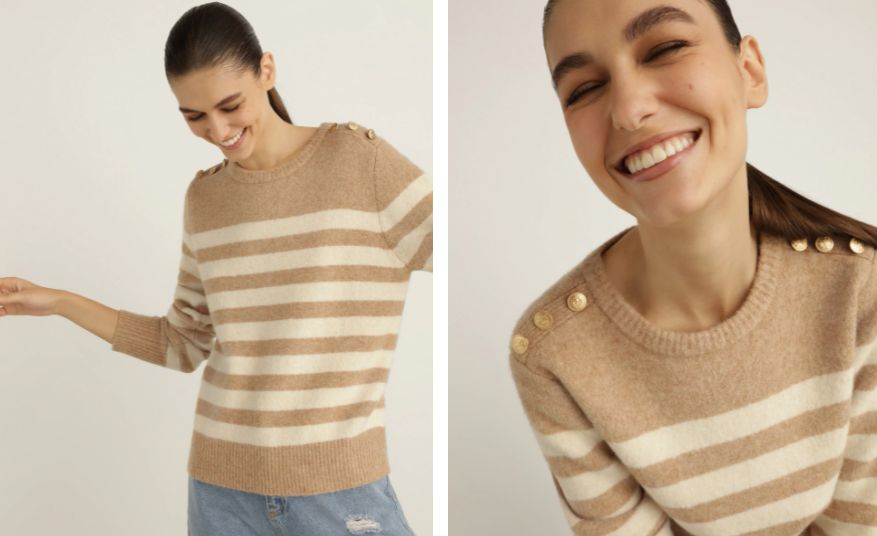 Te enseñamos ahora una prenda tan necesaria en estos meses como el jersey, tanto para llevar por sin nada como para combinar con cazadora, gabardina o cazadora. Nos quedamos con este de rayas y botones, sencillo pero elegante, y disponible en colores caramelo, natural, blanco y azul marino. Su precio de 29,99 euros haga que igual te plantees comprar más de uno para combinar. Y es que es suave, cómodo, abriga sin agobiar y sobre todo es de la nueva colección de El Corte Inglés. Si clicas aquí lo podrás comprar online.