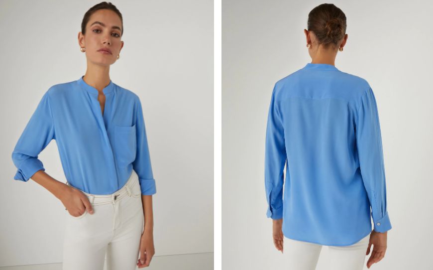 Y si hablábamos antes de blusas, qué te parece esta de nueva temporada de El Corte Inglés y de su marca Woman. Una blusa fluido con bolsillo de lo más vaporosa y elegante, ideal para las mejores ocasiones. Se vende en azul o verde y combina con todo, con ese aire minimalista y sobrio. Lleva botón en el puño, cuello pico, cierre de botones con tapeta y bolsillo en el pecho. Hecha 100% en viscosa, en este enlace la puedes comprar por 39,99 euros.