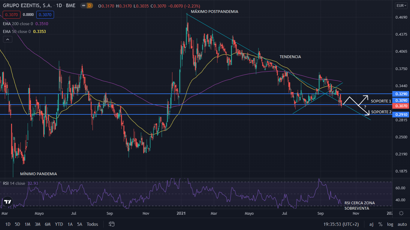 A nivel técnico, desde el mínimo marcador por la pandemia en los 0,177 euros por acción, Ezentis se recuperó rápido alcanzó los 0,387 euros por acción, creciendo un 118%. Tras dicho máximo el precio corrigió hasta los 0,219, donde rompió a alcista, marcando un nuevo máximo postpandemia, en los 0,477, un +116%. Después de alcanzar dicho máximo en enero de este año, su tendencia ha sido bajista durante los 7 meses siguientes. Soportado en los 0,30 euros, y en un intento de volver a alcista, su precio cayo rápidamente estableciendo se de nuevo en el soporte de los 0,30 euros. Para el corto plazo, teniendo el indicador RSI cerca de la zona de sobre venta, haber sido una caída de un mes sin parada y teniendo el soporte clave de los 0,30 euros. El precio en primera instancia ira a alcista para tocar el nivel de los 0,3290 euros, y después volver a caer a los 0,30 euros. Técnicamente el precio no debería caer más de los 0,30 euros, por lo que debería salir de la tendencia bajista, de todas formas hay que esperar la reacción del precio en dicho soporte, para que se confirme el final de la caída.