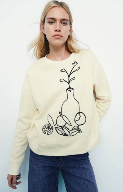 El diseño es el clásico, con cuello redondo, manga larga y acabados en rib. En un bonito color crudo que resulta muy sencillo de combinar. En el centro, un original bodegón bordado.