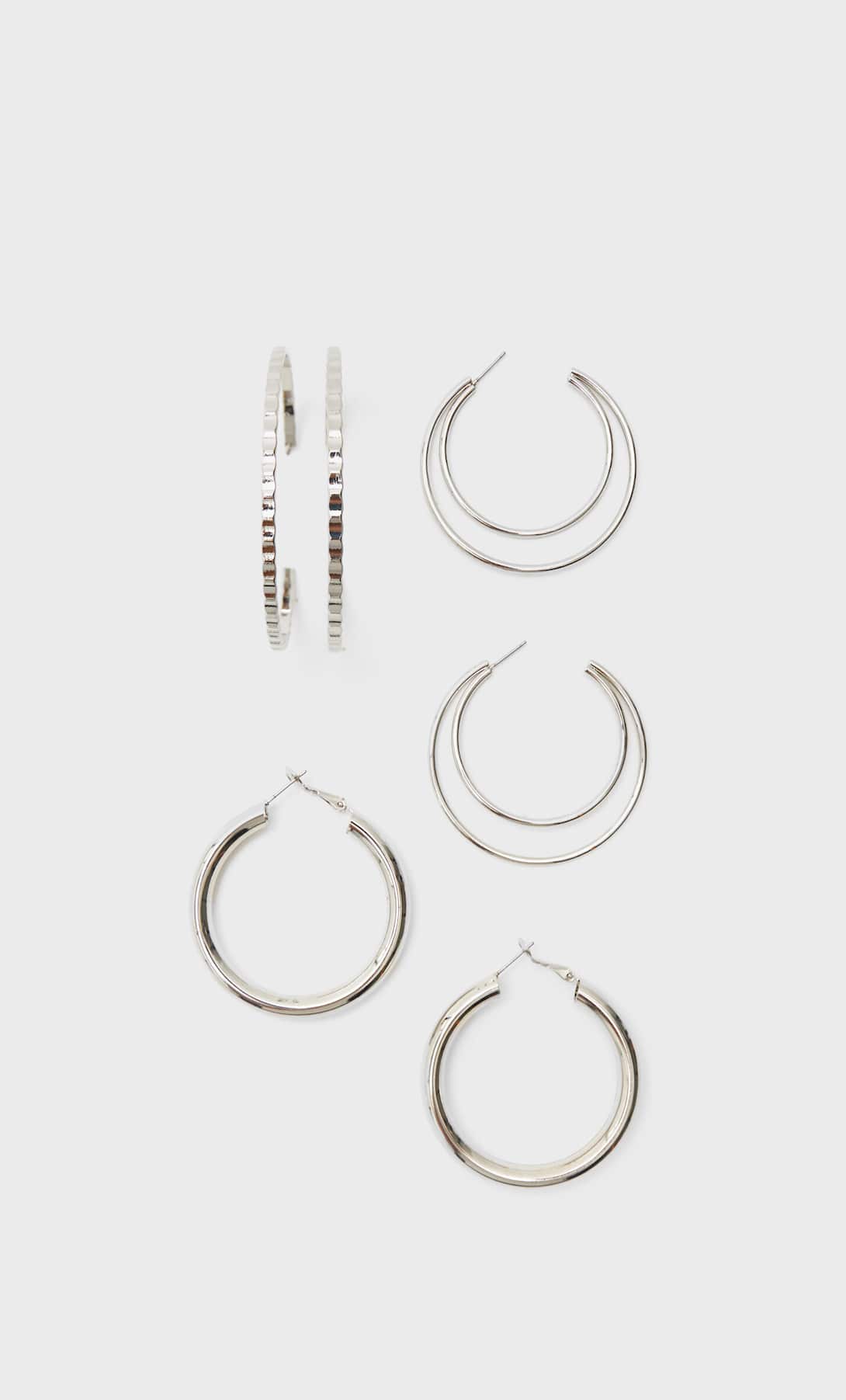 Los sets de pendientes de Stradivarius son ya un clásico. En esta ocasión nos hemos decantado por este que incluye tres pares de aros extra grandes. Fabricados en hierro, su estética es muy similar a la de la plata.