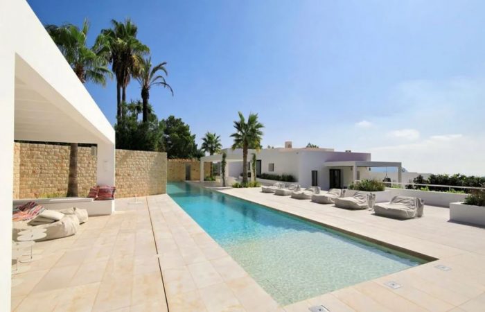 La propiedad cuesta 13,9 millones de euros y tiene una superficie construida de 907 metros cuadrados. También consta de terrazas con piscina y 6 dormitorios con vestidores y cajas fuertes, además de sus correspondientes baños. En su parte moderna tiene un dormitorio principal, con una gran terraza con vista al mar. Igualmente, cuenta con un apartamento independiente con 2 dormitorios, 2 cuartos de ducha, aseo y cocina equipada. Para los más pequeños, cuenta con una casa del árbol con una habitación en la que poder quedarse a dormir.