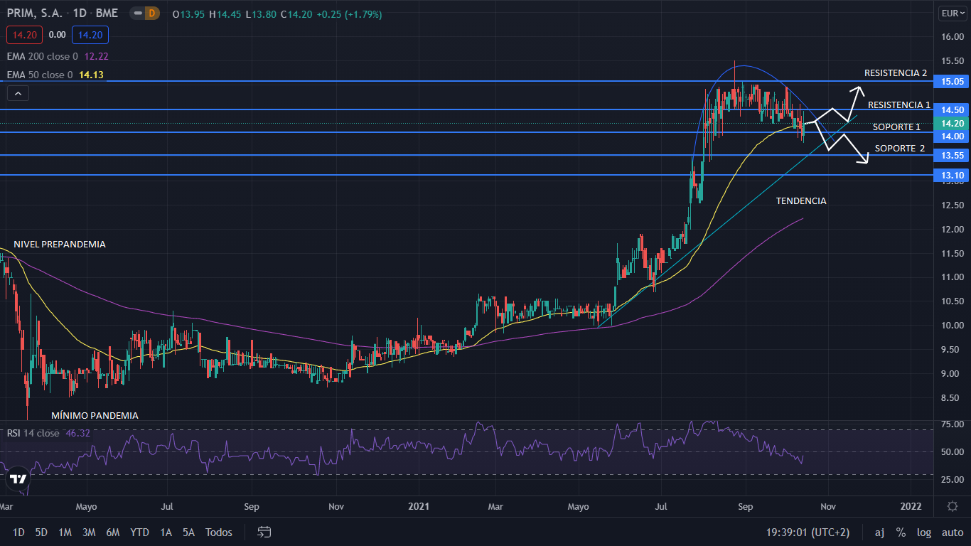 A nivel técnico, desde el mínimo marcado por la pandemia en los 8 euros por acción, su precio se ha mantenido lateral durante 12 meses. En marzo de este año el precio subía por encima de los 9,9 euros por acción, donde se establecía lateral nuevamente. El 28 de mayo Prim salía alcista con una fuerte subida del 48%, la cual ha marcado su máximo histórico en los 15,50 euros por acción. Actualmente es precio está haciendo parábola y apunta a bajista. Para el corto plazo, el precio alcanzara la línea de tendencia donde reacciona a alcista. Si tras rebotar en la tendencia, no consigue recuperar los 14,50 euros, el precio perdería la tendencia, para ir a siguiente soporte en los 13,55 euros.