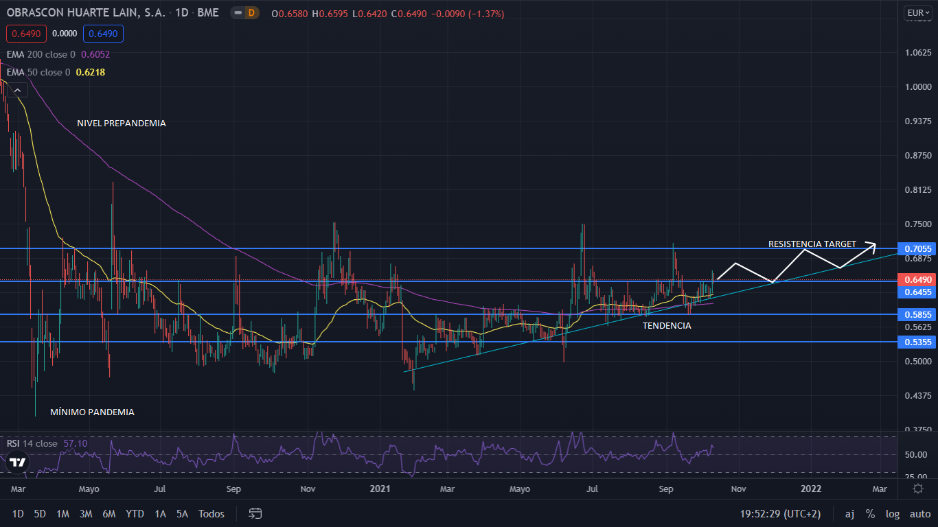 A nivel técnico, desde el mínimo marcador por la pandemia en los 0,39 euros por acción, OHLA se ha movido lateral entre los niveles 0,50 y 0,75 euros. Desde enero de este año su precio se encuentra en una tendencia alcista. Actualmente el precio se sitúa en el nivel de los 0,64. Para el corto plazo consolidaría los 0,65 euros, y en un medio plazo continuaría alcista para supera los 0,70 euros. Añadir que OHLA se encuentra a un 37% de su nivel de prepandemia, y a un 118% de su cierre del 2020.