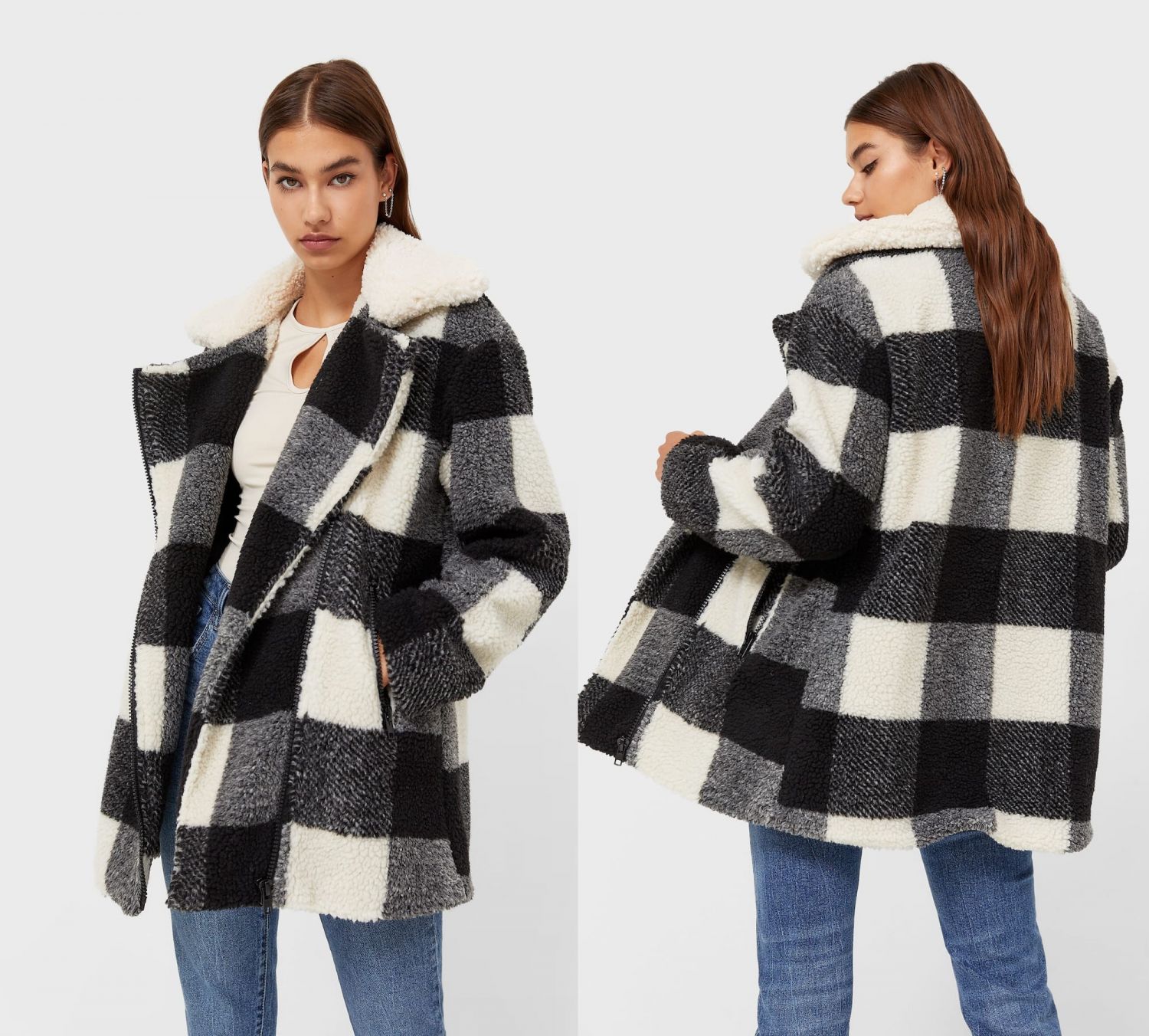 Por 49,99€ también puedes optar por este abrigo de borreguito de Stradivarius. Disponible solo con este acabado de cuadros en contraste y en varias tallas.