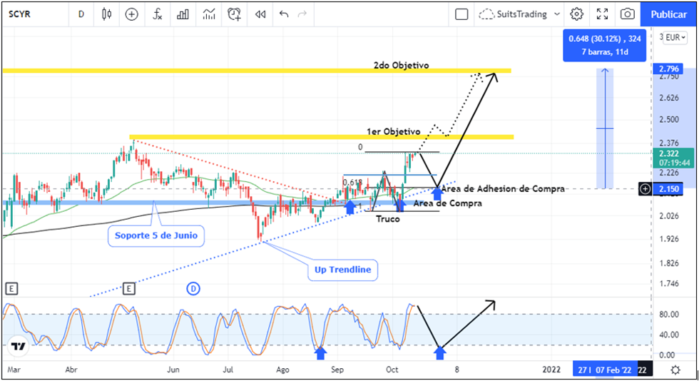 El pasado 8 de septiembre compartimos a través de Inversión.es, un análisis en el cual mostrábamos el potencial alcista para la acción de Sacyr en busca de un primer objetivo en niveles cercanos a los 2,39 euros cuyo valor corresponde a su máximo anterior de mayo de 2021. En ese momento el precio oscilaba los 2 euros por acción y estábamos atentos a la formación de un truco, es decir, una formación de V invertida la cual indicaría el agotamiento de las ventas y la primera señal de punto de giro al alza. Esta formación se ejecuta entre el 20 de septiembre y el 6 de octubre, justo un día antes de la exposición del nuevo plan estratégico de Sacyr el cual impacta el precio dando razón al análisis técnico que nos muestra el gráfico en marco diario.