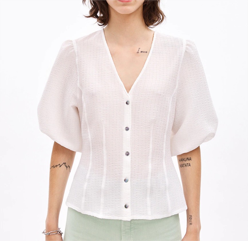 Es un top que puedes usar en otoño y primavera, ya que su tejido y diseño te permite que puedas ponerte una chaqueta o sencillamente una falta o shorts. Si te interesa este top de textura con manga abullonada y escote en V con cierre de botones, aquí es donde vas a poder encontrarlo.