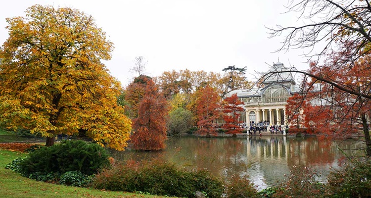 Durante los días otoñales sus jardines de árboles caducifolios muestran un maravilloso y pictórico cromatismo de tonos ocres, amarillos y rojizos, convirtiendo en un verdadero placer un paseo bajo sus ramas y las hojas húmedas que descansan en sus caminos. Por tanto, y como prueba la imagen, en otoño es obligatorio hacer un hueco de un par de horas en la agenda y dirigirse al corazón verde de la capital de España para quedarse abrumado por el colorido de su belleza en esta estación.