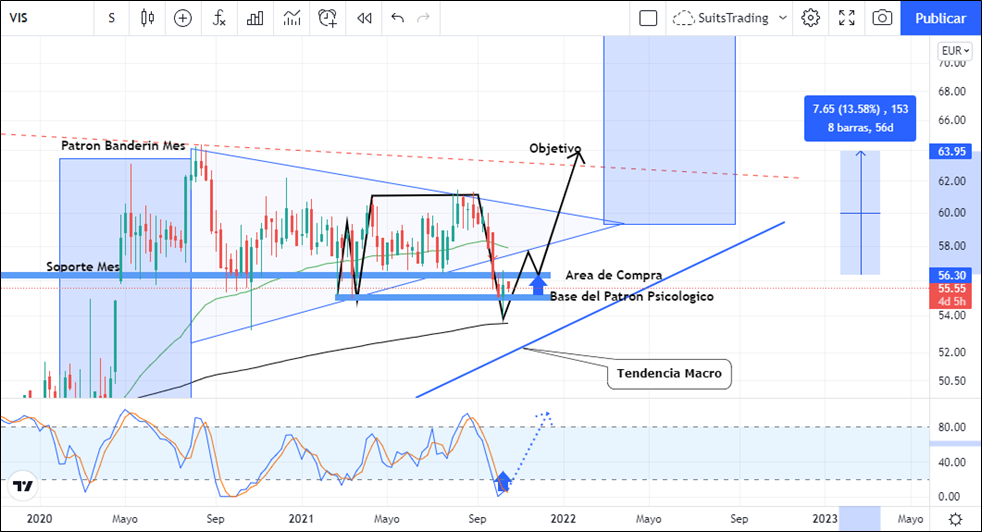 Como lo venimos comentando desde meses atrás, la acción de Viscofan en gráfico de marco mensual desarrolló un patrón banderín que promulgaba un precio por acción arriba de los 80 euros. Sin embargo, en la primera semana del mes de octubre el precio realizó una ruptura del nivel inferior del banderín que confluyó con el quiebre del soporte mensual más cercano que data de abril de 2019 en inmediaciones de los 56,5 euros. No por esto deberíamos pensar en una desvalorización porcentual de la acción de Viscofan, ya que técnicamente se encuentra visitando la media móvil exponencial de largo plazo de 250 periodos. Este indicador confluye con la tendencia alcista macro, la cual, de ser respetada, podría retomar su senda alcista.
