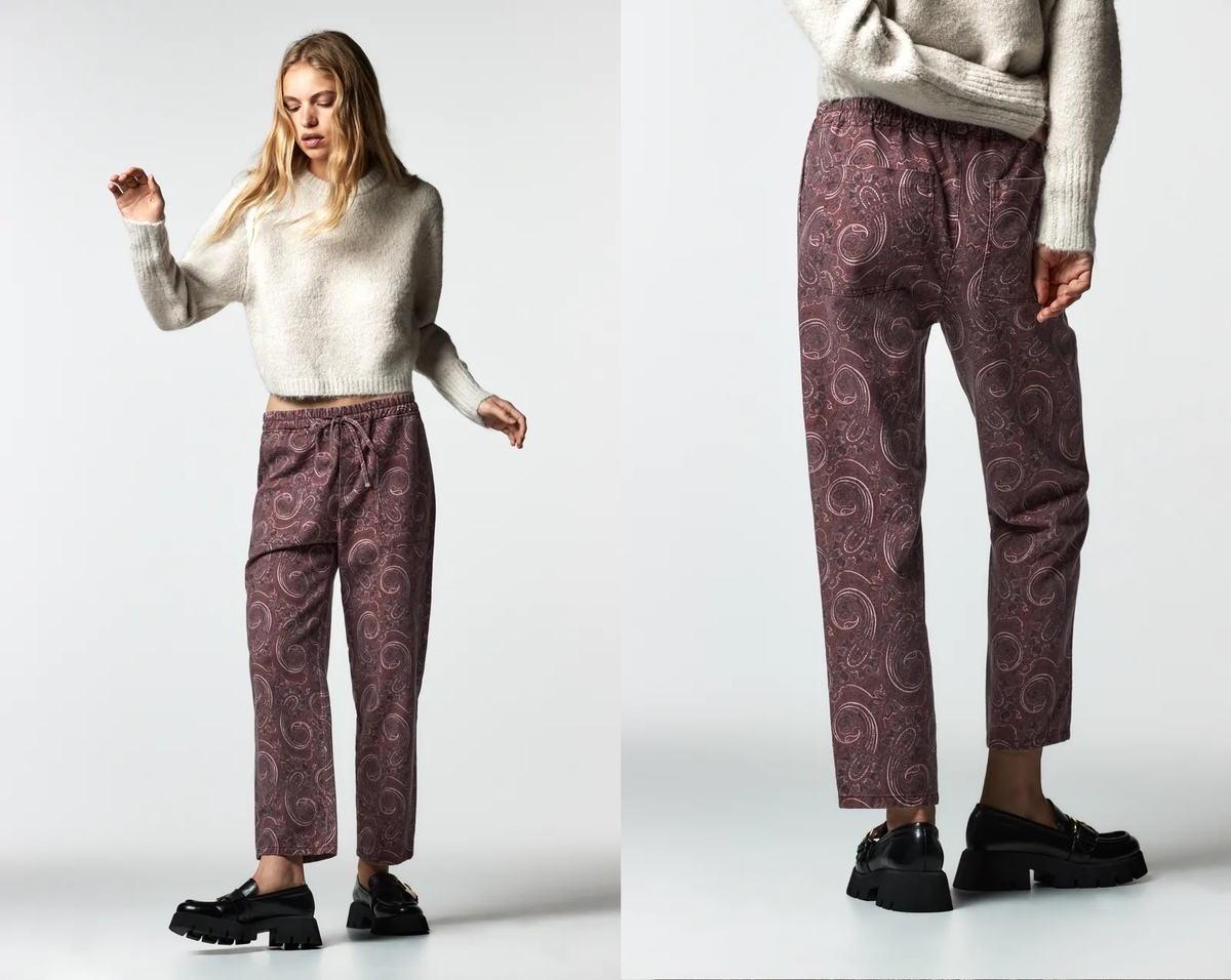 Si te gustaron los pantalones con un toque retro, seguro que también te encantarán estos otros pantalones pijameros de Zara. Disponibles en varias tallas y en este tono burdeos estampado por un 45% menos, es decir, por solo 15,99€.