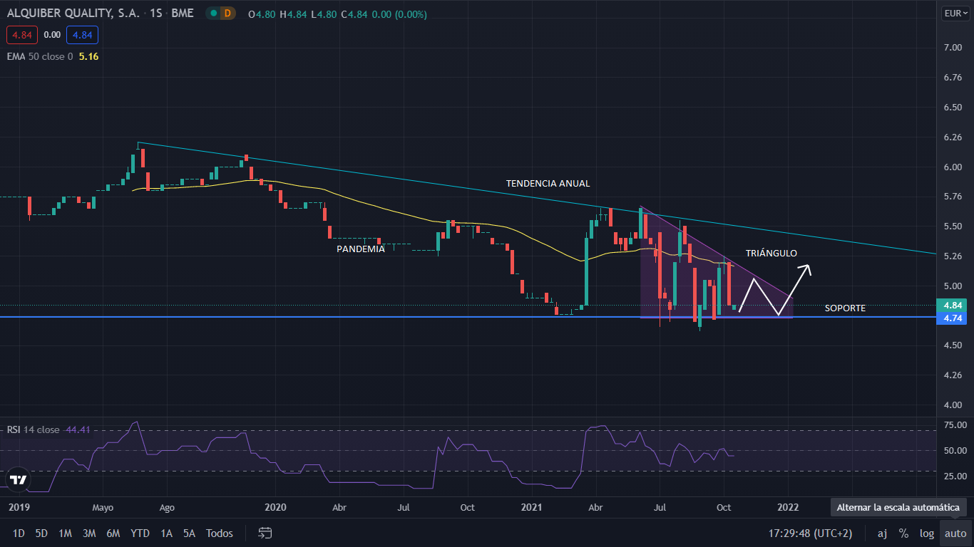A nivel técnico, Alquiber desde el 2019 en grafico semanal trae una tendencia bajista. Desde principios de este año. La cotización se ha movido lateral, entre los niveles 4,74 y 5,66 euros por acción. Actualmente está dando una formación de triángulo, por lo que tomando el soporte fuerte de los 4,74 y sus buenos resultados fundamentales, el precio volvería a la parte alta del triángulo. Para finales de este año su cotización apunta a la salida del triángulo de forma alcista, para ir a buscar la tendencia bajista anual.